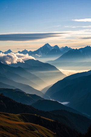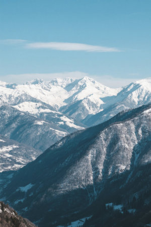 A stunning view of a mountainous landscape featuring snow-capped peaks and vibrant green valleys. Perfect for capturing the essence of nature and adventure.