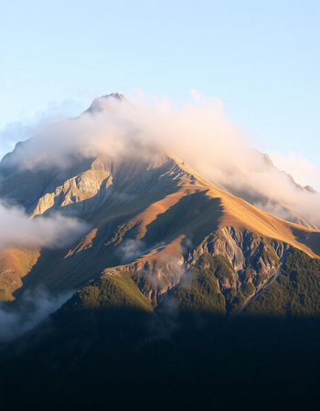 Mountain peak in the clouds at sunrise.