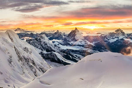 Sun setting behind the Matterhorn as seen form Monte Rosa, with mountains covered in snow