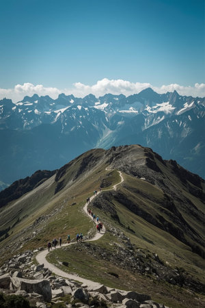Group of hikers walking along a winding trail on a mountain ridge with dramatic alpine backdrop. Captures adventure, nature, and exploration. Ideal for travel, outdoor, and landscape themes.