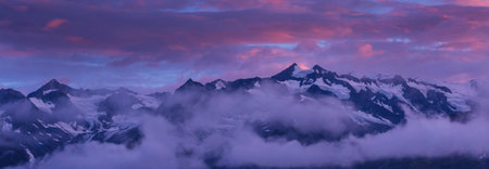 Rocky alpine mountains morning panorama. Cloudy sunrise on summer day. Grossglockner Mountain, Hohe Tauern National Park, Austrian Alps