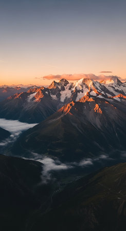Snow-capped mountain peaks glow warmly at sunrise, casting dramatic shadows.
