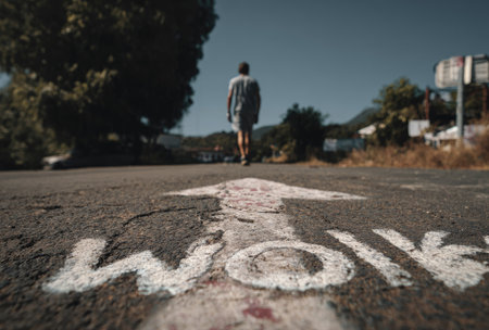 A person walks along a road towards a painted arrow, a concept of progress. The scene showcases a sunny outdoor environment with a blurred figure. The image utilizes natural light and a shallow depth of field, with a focus on the road surface and direction. This image may be suitable for various commercial uses.