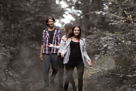 International team two guys and girl talking while hiking by forest, panorama
