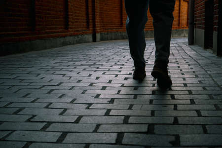 A woman in jeans walks through the narrow streets of the city. Cropped photo back view of legs. Brick walls around the pedestrian alley. Close up of person walking on paving stone street