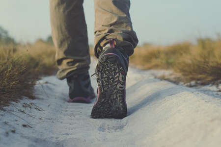 Trekking shoes woman walking in beautiful road trail at outdoor