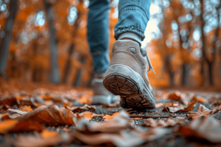 Feet sneakers walking on fall leaves outdoor Autumn season