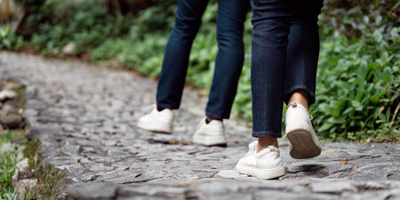 Hiking adventure on a scenic path. Close-up of two individuals walking along a rocky trail.