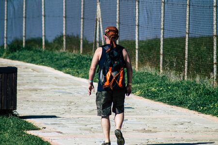 Limassol Cyprus March 16, 2020 View of an unidentified people with a face mask to protect themselves from the coronavirus walking in the street of Limassol in the afternoon