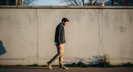 A young man in a denim jacket and beige trousers walks purposefully along a sidewalk past a textured concrete wall. The golden hour lighting casts his shadow on the wall, capturing a candid urban moment.