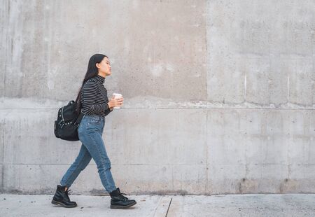 Portrait of young Asian woman walking and holding a cup of coffee against grey wall.