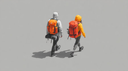 Two hikers are seen walking together on a grey background, showcasing vibrant backpacks and outdoor apparel, embodying a spirit of adventure and exploration.