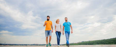 United group purposefully moves forward. Friendship tested for years. Men and woman walks dramatic cloudy sky background. True friendship grow with destiny obstacles. United threesome true friends