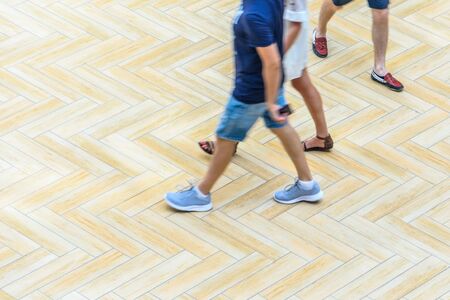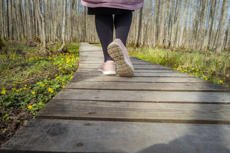 Legs of people engaged in fitness walking, on a walking wooden walkway