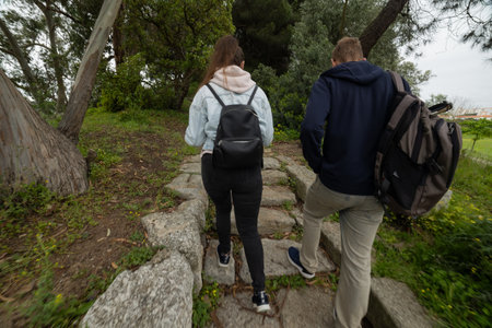 Young couple walking uphill on stone path outdoor