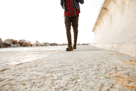 Cropped photo of african man dressed in shirt in a cage print walking on the beach while listening music with earphones.