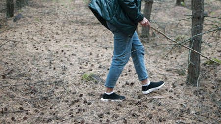 Rear view photo of female tourist legs with sneakers walking in a forest road.Summer day sunshine.Selective focus.Soft focus.