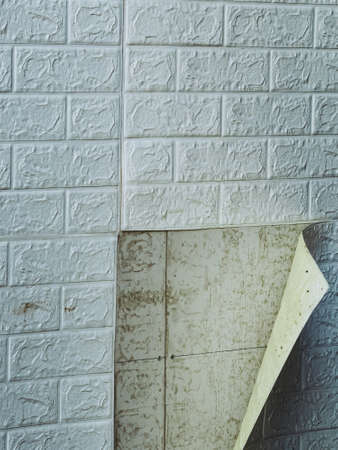 The wallpaper begins to peel off. Old white bricks wallpaper peeled off from the wall inside the room due to moisture or poor quality gluing. Repair and construction services concept. Selective Focus.