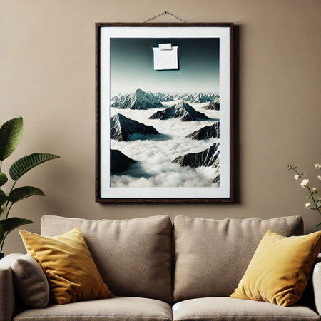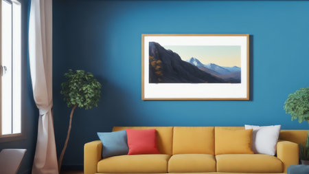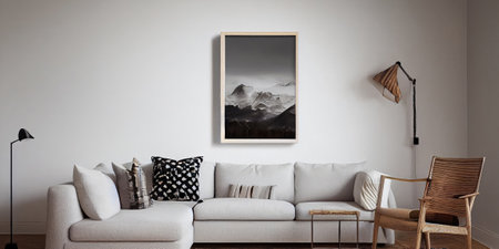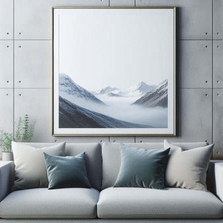 Mockup Wall Decor Frame Hangs In Cozy Minimalism Living Room With Com. T Sofa. Generative AI