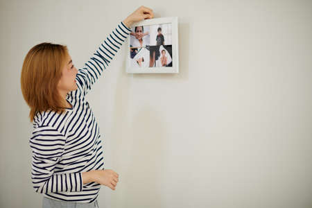 Young woman in striped shirt hanging frame with photos on wall in new apartment