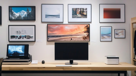 A modern and stylish workspace setup with a monitor, keyboard, and photo wall decor, emphasizing an elegant and creative work environment.