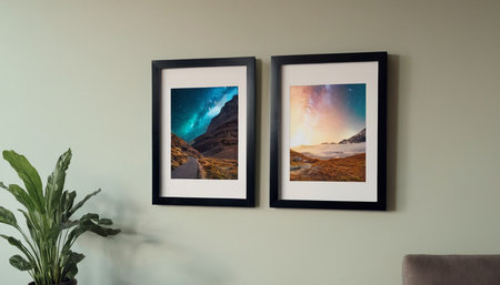 A student carefully arranging and hanging a variety of framed art pieces paintings and photographs to create a personalized gallery wall display in their home or office workspace