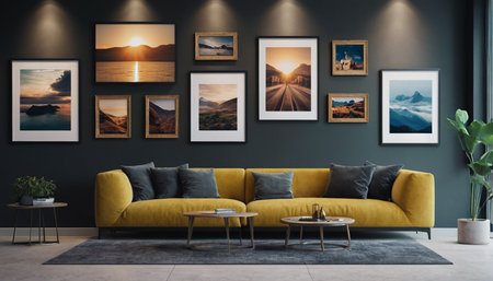 Interior of modern living room with yellow sofa, coffee table and pictures on wall