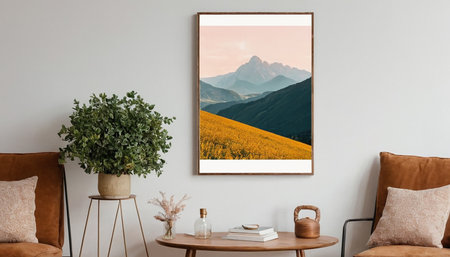 Mockup frame in interior background, room in warm tone, Scandi-Boho style, Generative AI