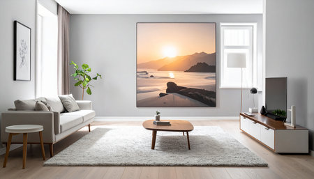 Modern scandinavian interior design living room with mock up poster frame. 3d render