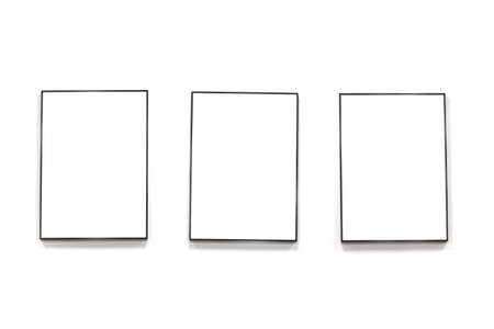 Three blank picture frames on white wall. Mock up, 3D Rendering