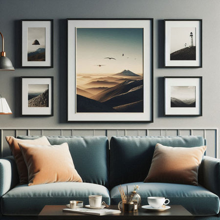 Interior of living room with blue sofa, coffee cup, plants and picture frames on gray wall. 3d render