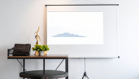 A blank projector screen hangs above a table with a bag, plant, and wooden mannequin, set against a white wall.