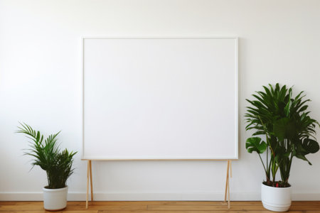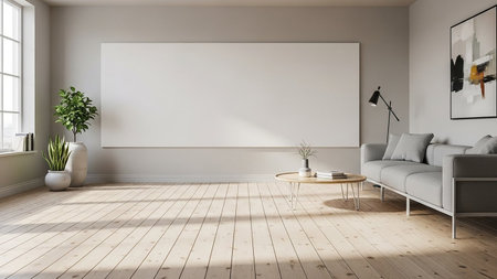 A modern living room features a large blank canvas on the wall, a sofa, coffee table, and plants.