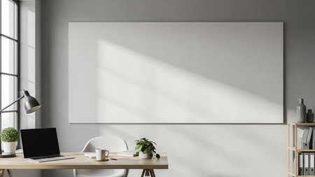 A minimalist home office desk with a laptop, plant, and mug is set against a grey wall with a blank whiteboard and sunlight casting shadows.