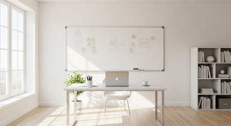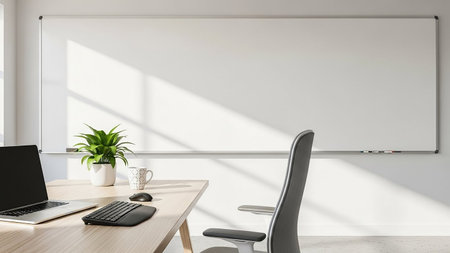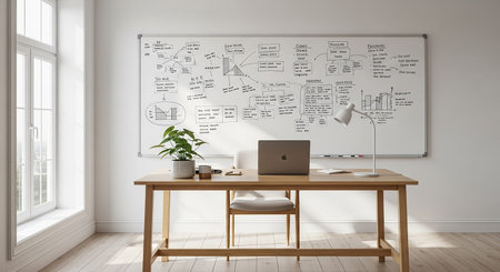 A bright, modern office interior a large whiteboard filled with handwritten notes and diagrams, a wooden desk with a laptop, and a potted plant.