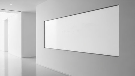 A bright white hallway with a minimalist design, featuring a large, recessed blank whiteboard on the wall.