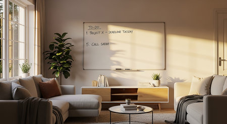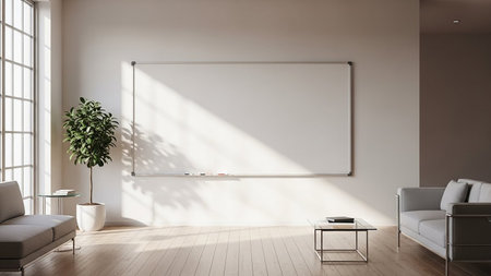 A bright, modern living room with a large empty whiteboard on the wall, illuminated by natural sunlight streaming through a large window.