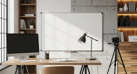 Concrete showing home office setup with a computer, desk, lamp, camera on tripod, and a large whiteboard on a concrete wall. resolution