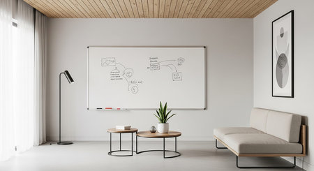 Comfortable showing a bright, modern office meeting room with a whiteboard displaying a flowchart, a comfortable sofa, and two round coffee tables...
