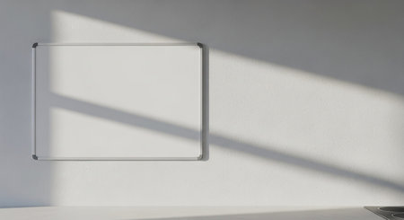 A white magnetic whiteboard is mounted on a light textured wall, with geometric patterns of sunlight and shadow cast across the surface.