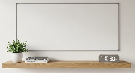 Clock showing whiteboard on a wall above a wooden shelf with a potted plant books and digital clock. resolution use.