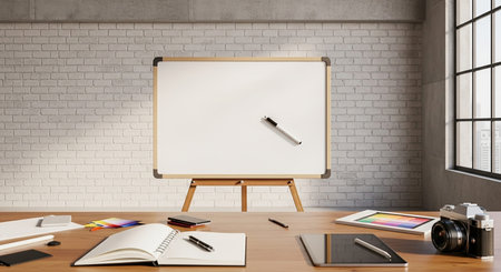 A whiteboard on a wooden easel sits on a desk with a camera, open notebook, and supplies in a room with a brick wall.