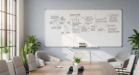 A modern conference room a whiteboard covered in business diagrams and notes, with a large wooden table and chairs in the foreground, illuminated by...