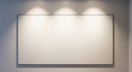 An empty whiteboard with a metal frame is illuminated by three spotlights on a textured wall.