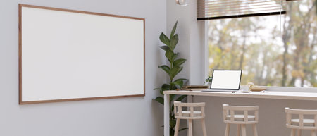 A cozy Scandinavian cafe co-working space with a laptop white screen mockup on a table against the large window, blank poster on the wall, stools, and indoor plants. 3d render, 3d illustration