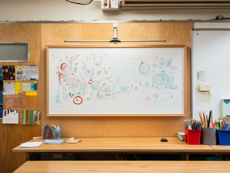 A vibrant selection of colored markers are displayed around an empty whiteboard in a cozy workspace. Perfect for creative projects, planning sessions, or educational settings.