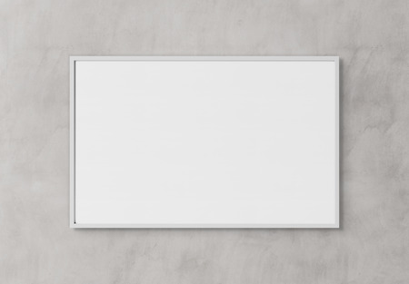 White rectangular horizontal frame hanging on a concrete textured wall mockup 3D rendering