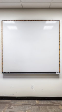 A blank whiteboard framed with wood and mounted on a classroom wall, ready for an educational session. The wall shows signs of frequent use, enhancing the realistic setting.
