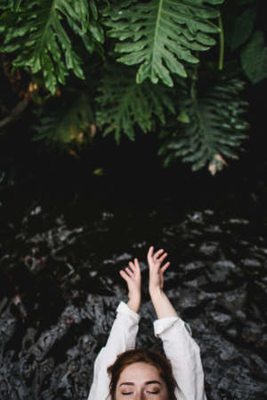 Closeup portrait of a beautiful girl with red hair lying in the water.