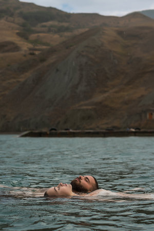 Middle aged man laying on water in blue lake under the rain in thunderstorm.